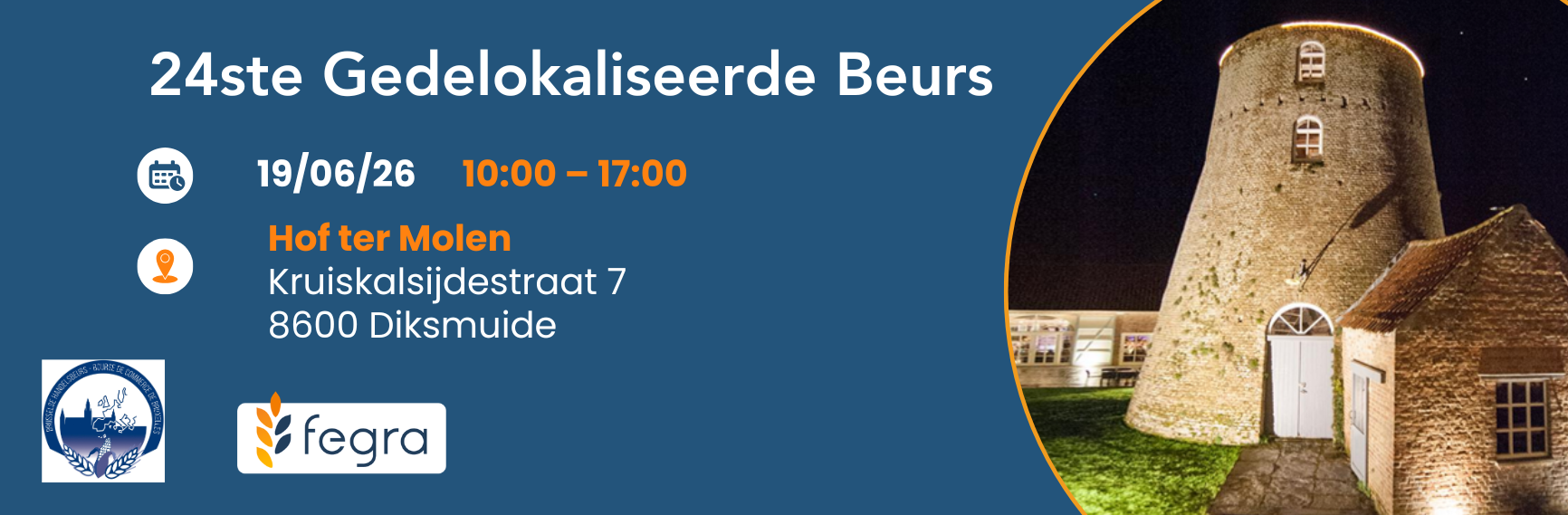 De 24ste Gedelokaliseerde Beurs van FEGRA en de Brusselse Handelsbeurscommissie zal op 19.06.2026 van 10:00 tot 17:00 plaatsvinden in Hof Ter Molen, Kruiskalsijdestraat 7, 8600 Diksmuide.